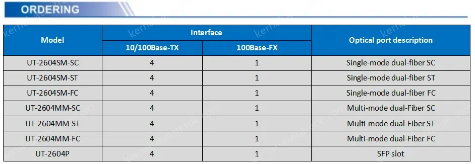 Fiber interfaces: 1*100Base-FX(SC/FC/ST)