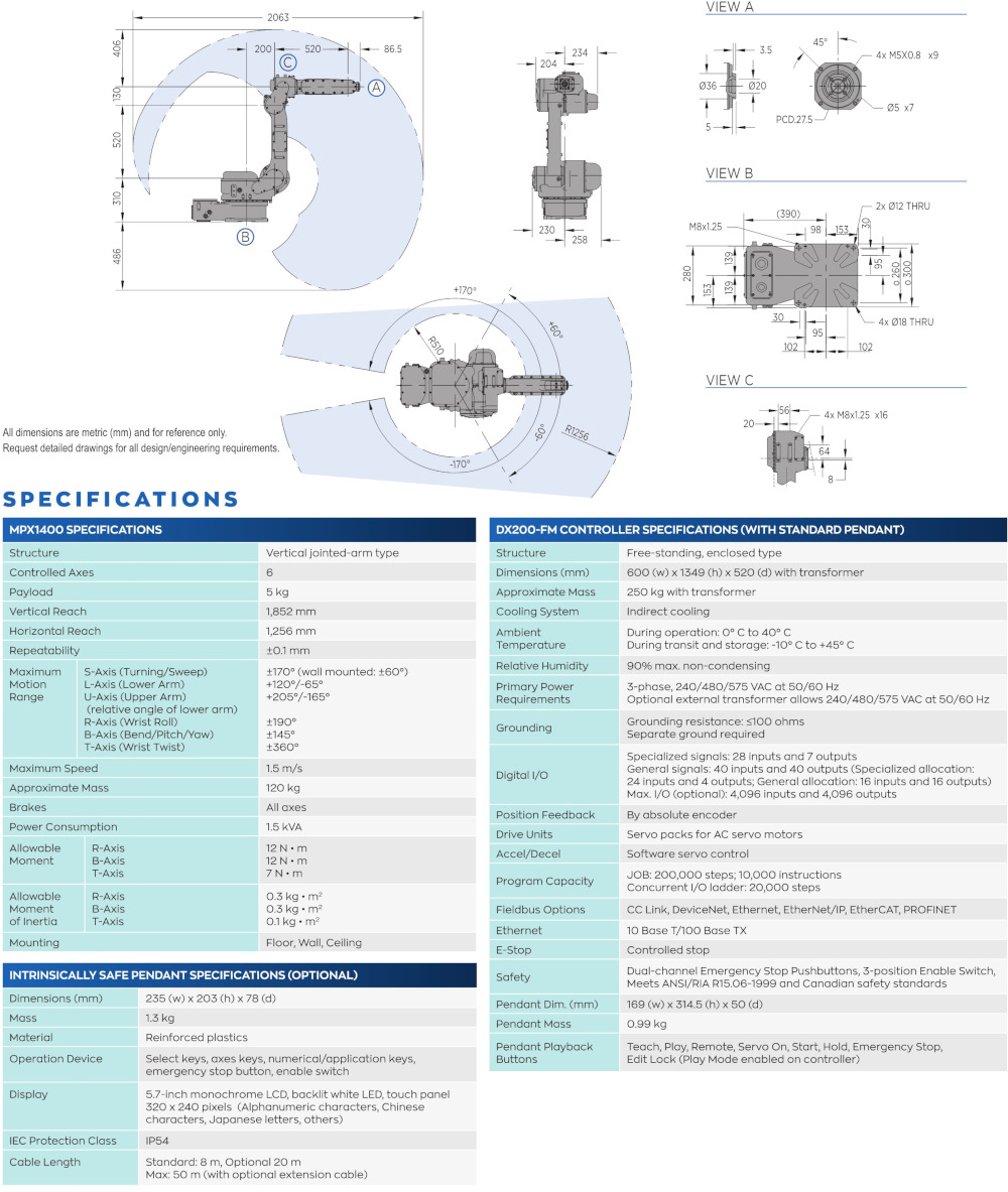 Optimized for painting smaller components, the six-axis MPX1400 robot offers outstanding performance for coating and dispensing applications. Its small footprint slim-arm construction allows for minimum installation space, and a broad motion range facilitates painting multiple parts at the same time. Factory Mutual (FM) approved for Class I, Div. 1 use in hazardous environments, this extremely fast and precise robot features a strait wrist with a 5 kg payload, as well as high allowable moment ratings, making it ideal for mounting a variety of spray guns and small bells.
